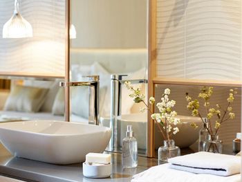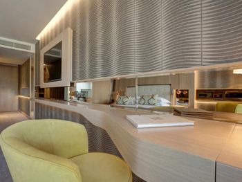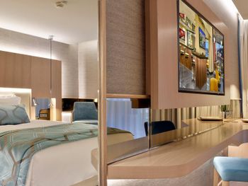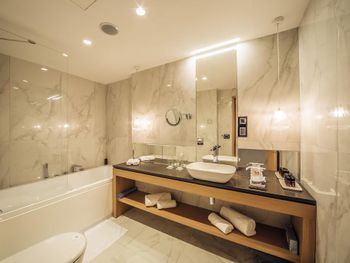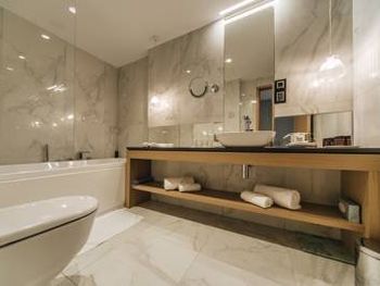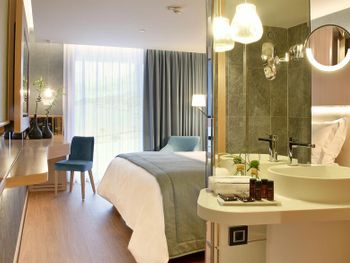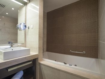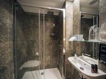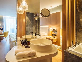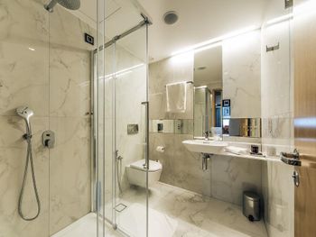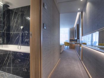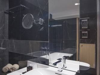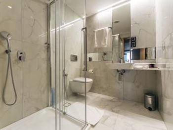 Крошечный номер, ванная разочаровала. Для отеля 5* это что-то из ряда вон. В ванной комнате только узкий душ и туалет и микро раковина. Основная раковина вынесена в сам номер, это видно на фото, но снимки, сделанные широкоугольной камерой не отражают реальность. Ванная комната кажется на них больше, чем она есть на самом деле. Вдвоем было трудно развернуться.