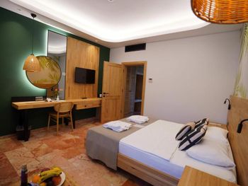 Номер подвёл, вроде бы свежий ремонт, но сделан ужасно, в углу комнаты на обоях чёрные пятна, скорее всего грибок. Ванная комната это отдельная история, унитаз старый, на стене плитка с дырками. Душ подтекает и все ещё льётся на пол. У нас был корпус с выходом из номера в бассейн, но в номере глянцевый мраморный пол и когда попадает на него хотя бы капля воды он становится скользким, мои дети по несколько раз упали и я подскальзывалась, хорошо, что обошлось без травм. И самое "приятное" это слышимость 100 из 100.