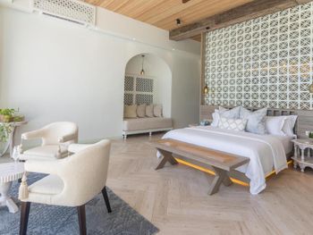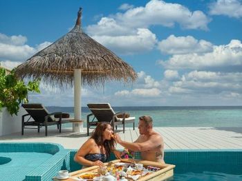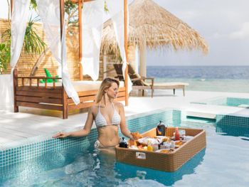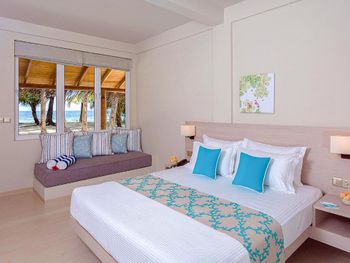 Пляжные виллы с бассейном и видом на рассвет или закат оформлены в типичном мальдивском стиле. В тщательно продуманном оформлении интерьеров традиции сочетаются с современной роскошью. Благородный дизайн серовато-зеленых тонах дополняет великолепный вид из окон.