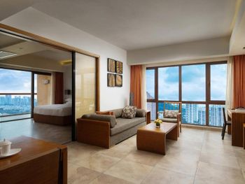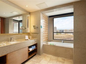 Не понравились заброшенные территории отеля, уход за садом оставляет желать лучшего, для Китая очень низкий уровень, старые обшарпанные стены коридоров. Не понравились служащие, которые оформляли, дали нам с детьми прокуренный номер, по английски не говорят. А вот уборщицы очень хорошие и приветливые, прекрасно убирают, отличные коридорные и другой персонал. А вот на оформлении номера работают не профессиональные люди, которые с удовольствием избавились бы от гостя. Не понравилось, что нам не дали бесплатные два билета в аквапарк, как было заявлено, мы заплатили за аквапарк дополнительно. Аквапарк только бассейны бесплатно, не верьте в эту акцию.