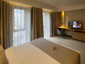 В комнате не работал замок и розетки, комнату поменяли после нескольких запросов. Отсутствуют некоторые предметы личной гигиены предоставляются по запросу. В тренажерном зале присутствует сырость и плесень на стенах. Плохой запах. Невозможно тренироваться. Меню ресторана дороге. Терасса на 4.ом этаже предоставляет хорошее меню и отличный кальян. Отсутсвует своя парковка. Уровень отеля на 3+ звезды не больше. Отелю есть куда расти и улучшать сервис. За меньшую цену можно найти отель лучше.