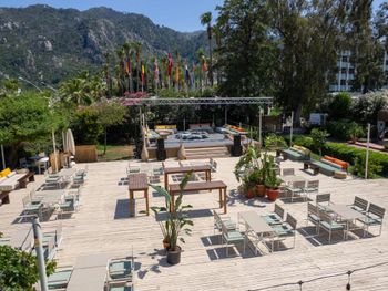 Еда скудная. Куча салатов из капусты, салатных листов и т.д, мясные блюда там в большой экономии: была либо курица/индейка и печень/сердце, реже кусочками говядина. Один вид супа и тот пюре. Выпечки много, но почти всё одно и то же и не вкусная. Днём очередь за мороженным, но бывало, что его не хватало. Вечером у бассейна жарили что-то типа люли-кебаб, официант прогонял одеваться (подходили в плавках и купальнике),что странно, у бассейна плавали и загорали на шезлонгах гости в таком же виде, но вот сделать 2 шага за шашлыком, нужно было одеваться. Питание всё по времени, опоздали на завтрак -сидите голодными до обеда. Ланч-бокс: 1 яблоко и1 сэндвич с начинкой из долек помидора, огурца и сыра. Анимация за 10дней: караоке, акробаты, пенная дискотека, 2раза турецкая ночь, примерно 5 вечеров не было совсем ничего, то аниматоры собирали желающих за деньги поехать в ночной клуб в Мармарисе до трёх ночи, то предлагали идти в другой отель на анимацию. Кстати, в посл.вечер мы забыли у сцены и бара пакет с лукумом и чаем( Спортивных мероприятий в отеле не было практически никаких, нет даже площадки для волейбола, футбола и т.д. Имеется бильярд, теннисный стол, бассейн с воротами для водного пола, в котором видели только один раз игру,ну и маленький закуток со спортивными тренажёрами. После уговоров, обустроили на пляже другого отеля воллейбольную площадку и желающие туда ходили. Пляж - узенькая полоска набережной, зажатая между пляжами других отелей, где были дети, кому-то это мешало. По границам участков пляжа с обеих сторон - стоянка катеров с бананами и др. водным развлечениями, которые гоняли вокруг; Территория моря, огорожена близко к берегу, словно в детском лагере; Замена пляжного полотенца только до 18ч; В номере тусклое освещение, в душе стояла вода в узком поддоне и переливалась через бортик на пол, на полу в душевой комнате создавалось болото; туго открывалась дверь балкона, фен работал только при зажатии кнопки. В номере пахло дымом сигарет. Плохая уборка.