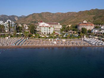 От аэропорта до отеля заранее заказали такси KIWI встретил водитель с табличкой, 47 евро в одну сторону, дорога хорошая, на рецепции в наш приезд работала русскоговорящая девушка Ирина. Заселили быстро (но и подъехали после 15:00)номер 139, живописный вид на бассейн, на зеленую гору и частично на море, достаточно просторный, нас было три человека, две удобные кровати и раскладная кровать-раскладушка с матрасом (удобная, но низкая), ванная просторная, напор воды хороший, кондиционер работал нормально. Белье чистое, но есть и дырочки. Еда достаточно хорошая, и эта еда не заканчивается никогда)))мы едим немного))) очередей нет, на балконе маленькая сушилка, балкон большой, на территории отелей музыка, нам не мешала, заход в море отличный, маме было удобно, море прозрачное, видишь рыбок, Плаваешь и любуешься горами. Красота!! Блюда делают вечером и на гриле, хлеб вкусный, запечённые овощи (вкусно), арбузы, сливы, груши, виноград, мясо тоже есть. Отличный бассейн. Музыку во всех отелях отключают в 24:00, беруши в помощь))Персонал отеля работает неплохо, на территории все время убирают, подметают; в основном мужская часть относится доброжелательно, женская не очень. Публика спокойная, как русские, так и иностранцы. Ребятам из Дагестана большой привет, не пили, не курили, хорошо лезгинку танцевали. Сами турки отдыхают. Последние дни омрачились приездом молодых турецких быдло девок, хабарики разбрасывали на территории, хотя пепельницы везде, втыкали хабарики в гамбургеры и апельсиновые корки, апогеем стал приход одной из девок в купальнике на ужин, официанты попросили приодеться. Захватите фумигатор, если будете спать с открытым окном. Погода супер, ветерок, нет кошмарной жары. Первый раз были в Турции около Кемера 16 лет назад, очень не понравилось. Второй раз решились только в этом году))) зеленый Ичмелер и шелковое море, погода, и сам Отель понравились (05.09-14.09).