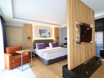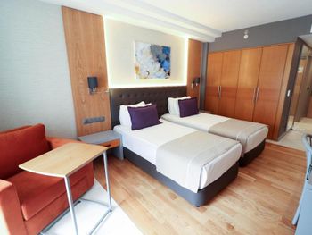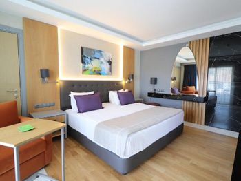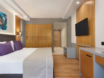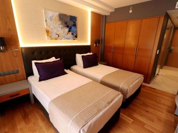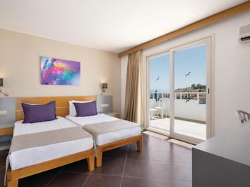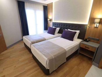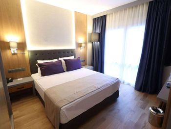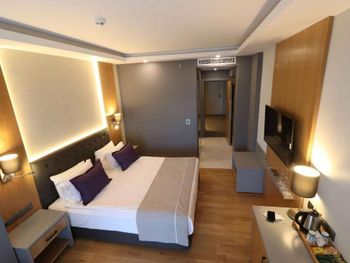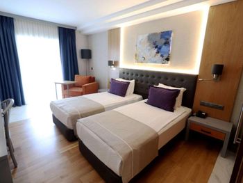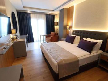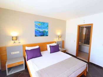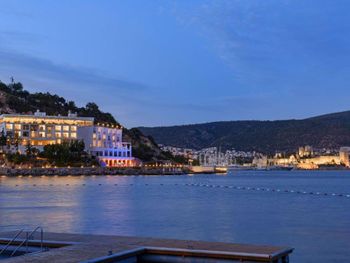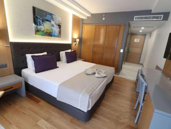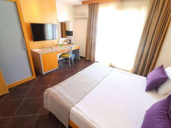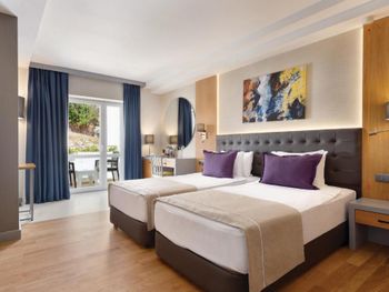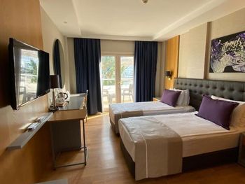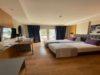 Главная фишка - расположение в милой бухте с прекрасным видом на центр города, находящийся всего в 5 минут езды на такси за 100 лир или на кораблике за 60 лир. Нам предоставили прекрасный номер с видом на море и огромной террасой. Питание все включено хорошо организовано , официанты вежливы и приносят напитки сразу как только вы захотите, отель европейского уровня. Гель, шампунь и кондиционер - в тубе, для кофе и чая все пополняется, воды в номере много - по 2 маленькие бутылки и 1 по 1,5 литра. Пляж только для взрослых и умеющих плавать, волн нет . Все остальные могут купаться в бассейне достаточных размеров. По английски понимают или пользуются голосовым переводчиком.номер лучше брать с видом на море , иначе окна будут выходить на гору.