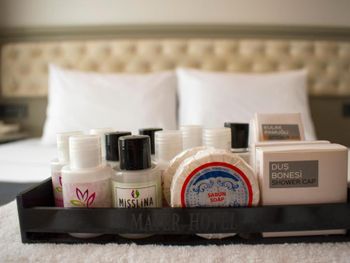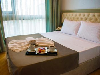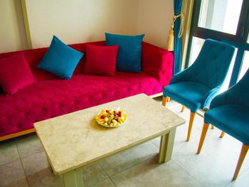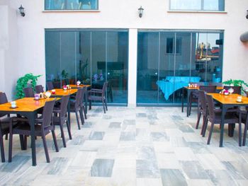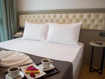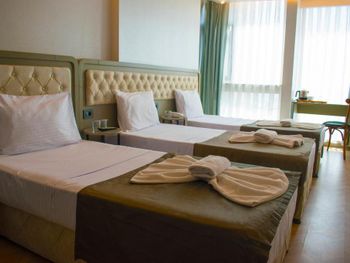 Изначально заказывали комнату с видом на море, по приезде нас поставили перед фактом, что вместо нашей комнаты мы получим комнату с видом во двор, вид на двор оказался видом на улицу, где находится вход в отель, комната оказалась на 3 человек. молодой человек с ресепшена несколько раз просил отменить бронь на букинге и перебронивать номер у них на стойке, говорил, что сделает скидку 10 лир, сами понимаете сколько это по нынешнему курсу. Так же ресепшионист звонил русскоговорящей сотруднице, чтобы она нам переводила, она уже говорила про скидку на букинге в размере 10€, когда она сказала об этом сотруднику ресепшена, он был очень возмущен. Мы приехали уже в 8 вечера и нам не хотелось с этим разбираться, да и ночевать надо было всего одну ночь, так что согласились на эту комнтау. В комнате были одноразовые тапочки, комплект полотенец на человека, в ванной была банка шампуня, мыло, в шкафу были дополнительные подушки, но каково было наше удивление, когда мы обнаружили, что нет одеял, вместо них были покрывала из вафли, я конечно понимаю, что лето и под одеялом жарко, но кто знает, когда эти покрывала последний раз стирали. Хочу заметить, что в комнате были хорошие шторы, т.к. прямо около нашего окна располагалась неоновая вывеска, ночью было темно и шторы свет особо не пропускают. Завтрак был обычный турецкий, яйца, приготовленные разными способами, помидоры, огурцы, сыры, маслины, оливки, фрукты. Больше в этот отель точно не вернёмся.