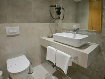 Брали улучшенный номер, но он оказался уставшим. Кондиционер подтекал, канализация все время щелкала. Кондиционер персонал почистили, а вот со второй проблемой справиться не смогли. Пришлось самим решать подручными способами проблему. Очень высокая раковина, наш ребенок не мог самостоятельно помыть руки, все время приходилось подымать. На завтраке не хватало соусов и на общих столах вилок, только ложки. Неудобно есть десерты ложкой. Аквапарк работает только в июле и августе.