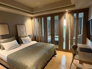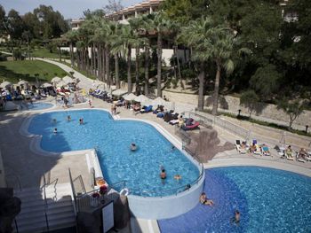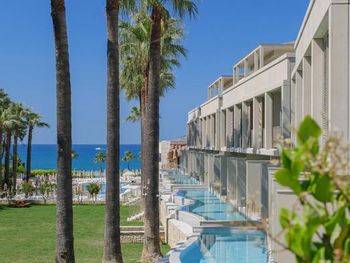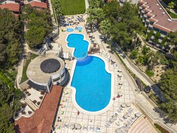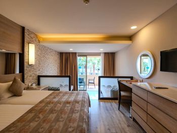 Самое странное - нам не разрешили пользоваться территорией соседнего резорта, который входит в этот же отель, но стоит отдельным зданием. Нам не разрешили ни ходить к ним в бассейн, ни брать напитки в баре на пляже и закуски, ни мороженое детям. Просто выгнали, сказав что с нашими браслетами здесь не положено, хотя у Вилладж своего бара на пляже нет и брать напитки и мороженое на пляже негде! В наш же бассейн, который вроде бы относиться к Вилладж, ходили все подряд, бассейн небольшой, получалось куча народа, тесно и неудобно. Бассейн только у пляжа на первой линии и на последней линии примыкает к небольшому аквапарку с небольшими горками. Посередине ничем не примечательная территория из травы и пальм. Детям заняться особо нечем, так как были в августе 2020 года, в пандемию короновируса, кроме вечернего минидиско в Резорте, да малюсенькой анимации у бассейна на пару часов ничего особо и не было. Пляж ужасный - сам пляж песок, а заход абсолютно не приспособленный, камни, тектонические плиты, столько людей при нас ранилось и падало, это ужас. Здесь вообще нужно было запретить купание, так как зайти невозможно без травм, либо плыть сразу по колено в воде, чтобы не пораниться. Но предприимчивые турки тут понастроили отелей и люди ищут вдоль берега место, где можно зайти в воду, ходя на пляжи соседних отелей. По еде тоже большой минус, разнообразия мало, все стояли в очередях, никакого шведского стола, только раскладка от официантов, еда не очень. В общем резюме - до пятерки вообще далеко, что то на 4 с минусом по классу отеля. Больше в него не поедем, кроме отличного номера, который мы сами себе выбрали задорого ничего хорошего не было, по сравнению с другими турецкими 5.