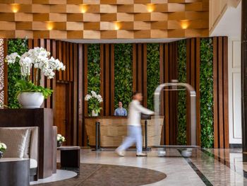 У отеля огромная территория, по которой курсируют гольфкары. Соответственно среднее время трансфера до ресторана или лобби - 15-20 минут.