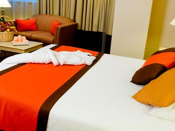 В номере на двоих был один комплект полотенец, пришлось не один раз попросить донести, после уборки история повторилась((( В номере жутко воняло какой то химией, которая так и не выветрилась до нашего отъезда. Просили не убирать номер с химией. Кондиционер давно пора почистить, в нем видна грязь. Номер, как и весь отель, довольно уставший. Потертая, местами грязная мебель. Везде в отеле (холл, коридоры) стоят довольно странные араматизаторы, которые выпускают довольно вонючий химозный запах (началась аллергия). В номере нет фена, хотя он элементарно должен быть. Отель давно пора обновить. Еле дождались, когда уедем, старались находится в нем как можно меньше. Интернет в номере довольно странный, работает волнами, то есть то нет. В том же баре интернет отличный.