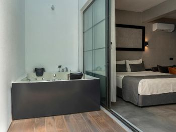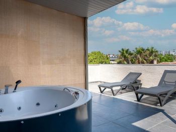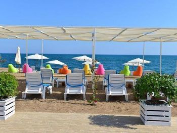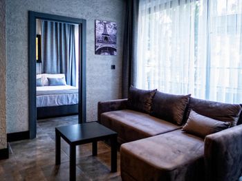 Минусы: 1) не особо удобное расположение, до пляжа ехать на автобусе; 2) завтрак очень скромный; 3) периодическое отключение горячей воды; 4) номера люкс находятся на -1 этаже, без окон. В номере слишком темно; 5)