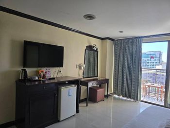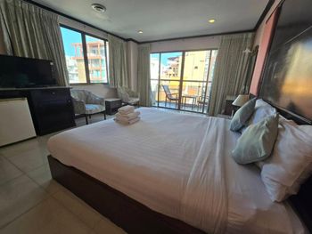 Прожили в отеле неделю, в целом понравилось. Хороший, просторный номер с видом на море, большой балкон. Хорошее месторасположение отеля, все есть рядом: массажные салоны, кафешки, круглосуточный магазин Family Mart, 7/Eleven. По близости Alcazar и Tiffany шоу, торговые центры Terminal 21 (у фонтана с дельфином на пересечении Северной улицы и Секонд роад) и Central Festival на Beach road. В номере чайник, холодильник, фен. По TV два российских канала. В номере убирались ежедневно, меняли постельное белье и полотенца, к работе горничных претензий нет, кроме немытых окон и пыли в шкафах. Персонал вежливый и очень доброжелательный, всегда готов помочь. Заказывали в городе в туристическом агентстве экскурсию, накануне экскурсии изменилось время выезда, почему-то позвонили не нам, а на респшен отеля. Отдельное спасибо отельному клерку, который предупредил нас и помог выяснить необходимую информацию. К сожалению, не знаем его имени. В связи с ранней экскурсией в отеле предоставили ланч-пакет вместо завтрака. Завтраки в отеле вкусные, но немного однообразные. Внизу на лобби можно бесплатно получить и поменять пляжные полотенца. Море в пределах Beach road никакое. Хотя есть два выделенных места для купания, одно напротив отеля Holiday Inn, а другое по центру, но здесь не купались и никому не советуем. Купаться ездили на пароме на остров Ко Лан.