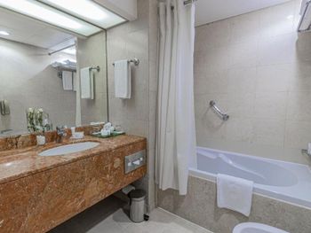 Не было халатов, пришлось просить. Нас было трое , а комплект полотенец на двоих. , одни тапочки. Отель старый. Лифт работает не понятно, никогда не знаешь повезёт тебя куда надо или поедет на другой вызов. Район грязный приличного кафе не нашлось , поэтому купили себе поесть в магазине. Пляж далеко, и это не полноценный пляж , ощущение , что загораещь у реки с ограждением. В Дубае лучше. Мы думали едем в пятизвездочный отель, но больше четырех ему не дашь. Не было сейфа.