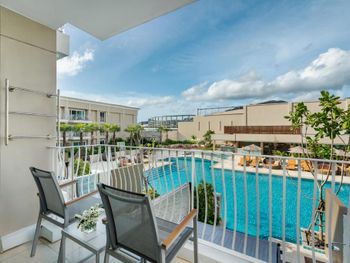 Отличное месторасположение- прямо в ТЦ, где фудкорт с вкусной и недорогой едой. До всего близко пешком. В номере с private pool есть еще и огромное джакузи в ванной и собственные лежаки у бассейна. В здании, где Lake Side довольно тихо, в отличие от основного корпуса.