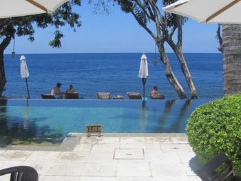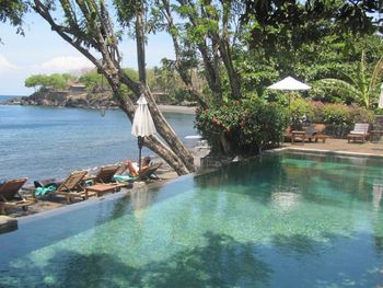 Классный бассейн и лучший пляж как нам показалось на всем Бали. Чистейшая вода и можно снорклить. Очень красивая чёрная крупная галька.