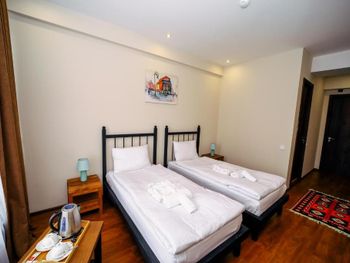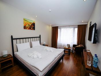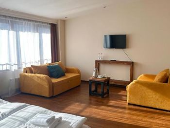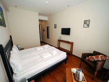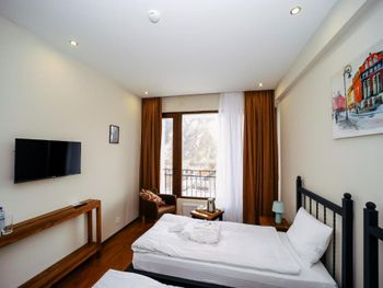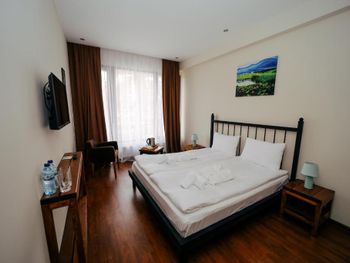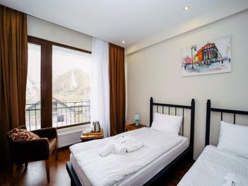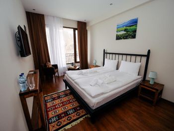 На перевале из-за мощного ливня и густого тумана доехали до отеля только в 3 ночи. Никакой круглосуточной стойки регистрации нет. все двери были закрыты, стучали, пока не разбудили сторожа. он сказал, что никого нет из персонала, номеров типа нет. номер был зарезервирован за 214 лари и бронирование подтверждено. Однако, через гугл переводчик сторож сказал, после переписки с администрацией, что они не знали, что мы приедем. Сторож гугл сказал, что вот ключ, завтра в 9 утра придет администрация, с ними решите с оплатой. Мы заказывали Делюкс, нам дали какой-то эконом, совершенно не соответствующий заказанному. С утра пришла администрация, которая очень плооооохо говорит на русском и еще хуже на английском. Сказали, что если отменим бронь, они возьмут 150 лари, а не 214. Естественно отменить в день выселения уже нельзя. За эконом взяли с нас 214 лари. Никаких извинений за то, что наш забронированный номер отдали кому-то не последовало. Плюсы: чисто, вид из окна. Минусы: отвратительное обслуживание, не говорят ни на русском, ни на английском, в номере воняло канализацией, жуткие кованые кровати, скудный завтрак с вялыми овощами и сухим хачапури, отсутствие круглосуточной регистрации, настольная лампа коротила и выключалась.
