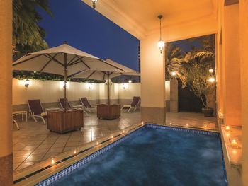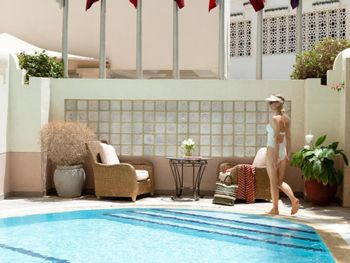 Вежливый персонал на входе и у бассейна! есть джакуззи, уютный небольшой дворик с лампочками Можно пешком дойти до Рынка Вакиф и Мина дистрикт