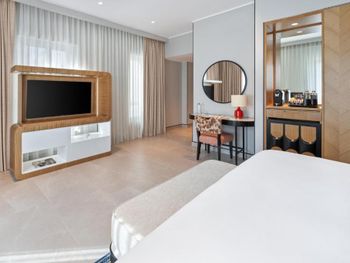 Самое неприятное, это грязь и изношенность номеров и общественных зон. Хотели замазать швы и трещины, скрыть подтеки, но сделано все так убого и небрежно, что жуть. В номерах убрано плохо, грязь на окнах, так что не видно погоды, грязь в ваннах, ковры в номере в пятнах, двери- грязные, мебель подразбитая. Мы были 14 дней, халаты не меняли. Приходилось просить на ресепшн и у самих уборщиков шампунь, гель и прочее, забывали пополнять воду, чай, шапочки, полотенца. Еда: это ужас быть тут 14 дней. Завтрак одинаковый постоянно. Мяса нет: одни противные сосиски и бекон. Остальное овощи: запеченные морковь и свекла, картофель, цветная капуста. Яйца жарит такая неприятная женщина, делает все для того, чтобы к ней не подходили, то пересолит, то не здоровается, то вместо двух омлетов сделает один, то сделает не по заказу, и все с таким лицом, будто мы ее обидели. За 14 дней ни разу не увидели ее улыбки. Выпечка: кексы 2 вида, 2 вида маффинов, оладьи с машины, слойки. Соки, не фреш. Одни и те же овощи: помидор, огурец, кукуруза, салат и тунец. Фрукты незрелые. Хлопья. Овсянка не вкусная: клей со вкусом старой крупы. Фасоль в томате и помидоры гриль, паста запеченная. Чай и кофе не станции. Постоянно стоит очередь. Люди готовят сами, официанты не приносят. То чашек не хватает, то ложек, то столы не прибраны. Официанты не могут нормально и быстро убрать стол, протереть его, такое впечатление, что тряпку первый раз в жизни взяли. В номере ложек не хватает, мы принесли одну из ресторана, она опять пропала, не знаю, что с ними персонал делает. В номере все чашки и бокалы разнобой, где что нашли, то и дали. Грязь кругом. Пальмовая терасса закрыта. Дети вместе во взрослыми в одном бассейне, хотя ранее (когда это был Мувенпик) бассейны были разные: отдельно для детей, отдельно для взрослых. Кровати для загара утром грязные и засиженные птицами. Никто даже не почистит от помета. Все стелят полотенца на какашки. Полотенца многие обтрёпанные, я помню их с 2014 г.