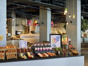 Гостям подают завтрак «шведский стол», континентальный завтрак или азиатский завтрак. При Mövenpick Resort Al Marjan Island работает ресторан, где подают блюда американской кухни и блюда французской кухни. По запросу для гостей приготовят вегетарианские, халяльные и веганские блюда.