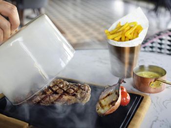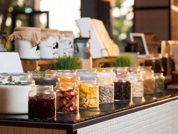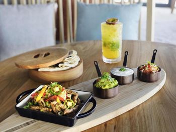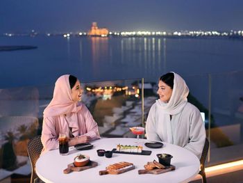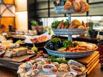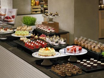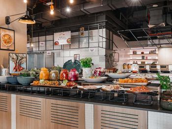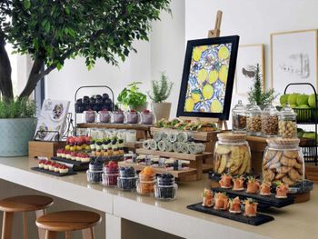 Гостям подают завтрак «шведский стол», континентальный завтрак или азиатский завтрак. При Mövenpick Resort Al Marjan Island работает ресторан, где подают блюда американской кухни и блюда французской кухни. По запросу для гостей приготовят вегетарианские, халяльные и веганские блюда.