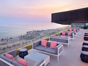новый отель, современный дизайн, хорошая постель, вид с балкона, кафе на крыше, бар на пляже