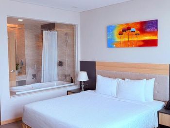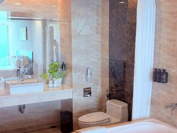 Отель именно 5-ка. Большие номера, в номере есть все необходимое, рыльно-мыльные, тапочки, халат. Для любителей ванна отделяется от спальни стеклом)). Везде чисто, уборка номера, смена белья и полотенец каждый день. На полу чистое ковровое покрытие. Вид из номера на море изумительный (жили на 22 этаже). Хорошие для Азии завтраки. Бассейн на 5 этаже, шезлонги, матрасы, полотенца все есть. Можно заказать еду из ресторана прямо в бассейн. Цены в ресторане отеля незначительно выше, чем в кафе на улице. На первом этаже есть казино. Пляж через дорогу.