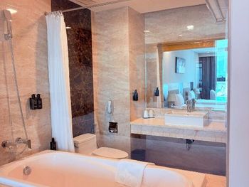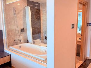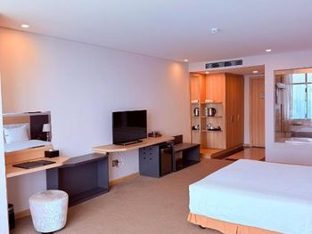 По «инициативе» ресепш чуть не опоздали на самолёт. Вышли в 6 утра, сдали ключи. Пока они проверяли номер, пошли на завтрак. Вещи оставили по согласованию с персоналом напротив ресепшн. Вернулись с завтрака - вещей нет. Нам сообщили, что погрузили их в какой-то автобус и он уехал. Час до аэропорта мы провели в ожидании - пока посмотрят камеры, пока мы проверим все стоящие на парковке автобусы. В итоге вещи нашлись под лестницей. Мы чуть не опоздали в аэропорт - никаких извинений или помощи мы от сотрудников этого «пятизвездочного» отеля мы не получили. Теперь о системных проблемах: 1. Пляж. У самого высокого отеля самое маленькое количество лежаков на побережье. К 8 утра все лежаки заняты, но людей нет. Все стелят полотенца и идут завтракать. В целом лимит на «простой» лежака без человека 30 минут, но тут это правило не соблюдают. Вместо этого смотрящие на пляже продают платные места. Кроме того, могут вынести припрятанный лежак для сильно возмущающихся постояльцев. Для отеля такого уровня ситуация с лежаками - просто позор. Именно по этой причине второй раз в этот отель не поедем. 2. Завтрак. К 8 утра всю рыбу съедают, ее никто не обновляет. Рыбу дают только белую, никаких креветок или прочего, что в рекламе отеля, нет. Сплошная свинина и пирожки. 3. Матрац на кровати плохой - скрипит и ездит. 4. Китайцы делают отрыжки на завтраках и очень громко говорят всю ночь. Русские ведут себя нагло, особенное, если им нужен твой лежак.