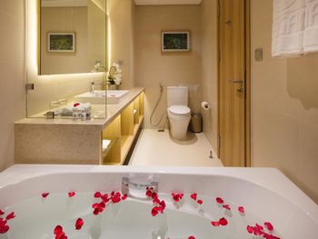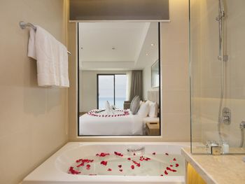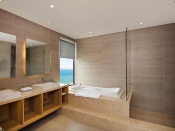 Огромный номер. Мы снимали полулюкс с видом на океан. В нем есть отдельная гостиная. Большая и удобная ванная комната с душем и ванной. Две раковины. Есть необходимые гигиенические средства. В спальне большая и удобная кровать. Кондиционер в комнатах работает очень комфортно. Есть выход на балконы. Расположение хорошее для отеля на второй линии. Вокруг множество ресторанов. До пляжа недалеко, особенно, если сразу арендовать скутер. В гостинице есть подземная парковка, где можно поставить арендованный скутер. На крыше есть бассейн. Забронированный нами номер находился этажом ниже, так что до бассейна очень близко, если не хочется идти на пляж.