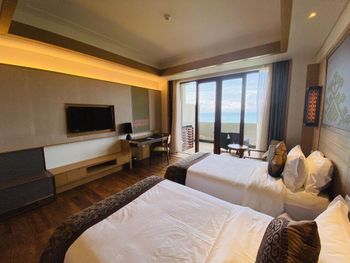 Кровать неудобная, матрас жесткий, что в 1 номере, что во втором. Купаться запрещено. Рядом особо нет мест куда сходить, час мы гуляли по береговой линии и встретилось по дороге всего 2 сомнительных заведения (со стороны дороги), на пляже ничего нет. Магазин маленький для покупки напитков минут 15 ходьбы. Сотрудникам бы разобраться с картами, выучить пару иностранных слов (по типу такси, багаж и тд) , нам 30 минут вызывали такси до другого отеля, потому что сотрудник не мог понять, где он находится, а отель находится на пляже ялонг бей, достаточно известный отель и пляж.