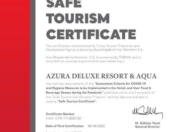 Курорт может похвастаться уникальным расположением: из большинства номеров открывается вид на море, бассейн и озеро, реку и лес. При желании гости могут остановиться в семейных номерах или в люксах повышенной комфортности. Однако, независимо от предпочтений гостей по размещению, во время отдыха в курортном отеле Azura Deluxe & Aqua Sorgun все постояльцы будут окружены роскошью, комфортом и развлечениями. В открытом бассейне оборудован 1 лифт для людей с ограниченными возможностями. Кроме того, отель готов предложить гостям вкусные блюда от профессиональных шеф-поваров, бары, каждый из которых отличается своими неповторимыми вкусами, и рестораны, где для посетителей приготовят шедевры мировой кухни. Утром гости могут проснуться под звуки соловья и других птиц и поплавать в искрящемся на солнце бассейне и прозрачном море. Пляж при отеле был отмечен наградой Голубой флаг. Также на курорте Azura Deluxe & Aqua Sorgun предлагается широкий спектр услуг — от сауны до спа-салона, фитнес-центра и парикмахерской для мужчин и женщин. При комплексе открыты бутик, ювелирный магазин и торговый центр. Организуются фотосессии. Для гостей оборудована игровая комната. В отеле работают ночной клуб и мини-клуб. В числе прочих развлечений — аквапарк, шоу, проходящие в амфитеатре, а также прочие увеселительные мероприятия!