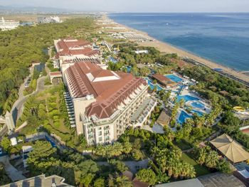 Довольно большая, зеленая, красивая, чистая территория отеля. Красивые просторные холлы, рестораны, игровые зоны, СПА. Приветливый персонал, готовый помочь. Хороший аквапарк для всех возрастов. Вообще, для детей здесь есть всё, скучать и голодать (если только не жуткие привереды) не будут. Вкусная, многообразная еда почти круглые сутки)) Хорошая чистая пляжная зона и море. Можно выйти за территорию и прогуляться по «фисташковой роще», где растут одни сосны))) Или дойти до небольшого озера и реки, по которой в море уходят прогулочные кораблики. Так же в пешей досягаемости небольшой поселок, где можно купить разную мелочевку.