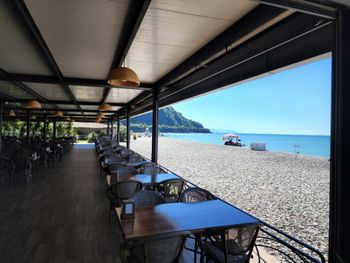 На территории очень дорогое кафе. Рекомендуем прогуляться до соседнего антуражного ресторана на берег.