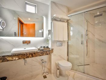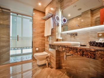 не хочу быть предвзятым, но в номере, почти за 8000 руб в сутки, не понравились панорамные грязные окна, а открытый вид из окна был для нас главенствующим, рваные шторы на месте их соединения с балконной дверью, малюсенький номерок, закрытый в обеденное время ресторан, так как не успели убрать утренний шведский стол, душевая, вода в которой, из под ног уходить не желала и ещё бы чуть-чуть и начался потоп. да, и длительное ожидание при заселении в номер. прибыли в 12, согласны конечно были ждать до 14.00, точнее обязаны, но и в 14.00 не заселились, просидели ещё около получаса в холе отеля. но за то на следующий день при выселении , очень чётко нам дали понять в 11.55, что пора уходить.