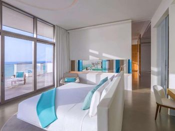 Номер с видом на море Suit был прекрасным но прям над стойкой диджея -соответственно шум нереальный в номерах(в рождество и праздники это было в принципе даже ничего хотя бы добавляло атмосферу ) всех выходящих на бассейн который с шумом убирают (и территорию вокруг )каждую ночь.Номера не на море —выходят на город но город то вы видите вдалеке а вблизи-все как то мрачно,но мы отказались даже по другой причине —так как нам предложили номер прям возле вентиляционного шума.показали другой на 500€ дороже в сутки с видом на море такой же но мы отказались (ради полтора дня).