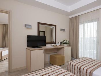 Номер маленький , бронировали с одной большой кроватью дали с двумя. Номер под крышей ( очень нагревался за день - душно и жарко) , плохо справлялся кондиционер ( была поломка), или очень холодно ( замерзали), когда отключаешь спать невозможно. Балкон без крыши ( не посидишь в жару). Очень плохая уборка ( полы мыла сама), песок , мелкий мусор не убирался с пола, балкон вообще не убирался( полы очень грязные). Один день вообще забыли убраться. Нет принадлежностей в ванной комнате кроме мыла в дозаторе, ватных палочек, трех ватных дисков и швейного набора( да и одной! шапочки для душа) Причем диски и палочки не пополнялись, когда сказали на ресепшене что вообще не убирались, только тогда положили за два дня до отъезда ( были 11 дней ). В ресторане в отеле были мухи назойливые очень, на пляже и то не видели ! Невкусный кофе, это факт.Ходили в хаммам с массажем , спросили сколько по времени - 70 минут, в итоге 10 минут мыли и 10 минут массаж. Больше не ходили( развод). Да , интернет бесплатный всего 1 час , дают пароль. Перебои с ТВ ( российские каналы не показывали иногда вообще," нет связи" на экране - надпись) раза 3 такое было ( не целый день, периодически). мини бар пополняют раз в неделю. Постель раз в три дня ( но не уверена что нам меняли...так как обещали) . Нет одеяла с пододеяльником, какой то синтетический плед ( его точно не меняют...) спать некомфортно под ним. Анимация на немецком , дискотеки до часа ночи в номере все слышно. В раковине нет заглушки, ничего не постираешь( тот же купальник). На пляже много отдыхающих из Турции , расслабиться не получается , так как очень громко и постоянно разговаривают ( как на рынке орут), немцы спокойные и доброжелательные, почему турки так разговаривают непонятно? как в лесу, и им все равно на отдыхающих и тишину и спокойствие ( один раз чуть мужа футболку не забрали, висела на крючке), муж как рыкнул... Ребята аниматоры веселые и доброжелательные( но нетрадиционной ориентации).