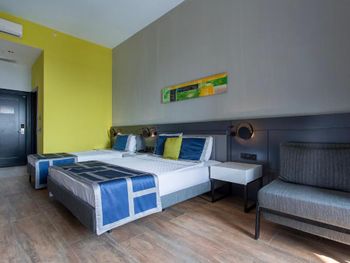 Во время вечерней анимации в номерах очень шумно, с маленьким ребёнком неудобно, попросите персонал вам помочь с выбором тихого номера. Так же пляж, который непосредственно возле отеля не очень хороший, из-за песка вода мутная и из-за скал (или что это) очень небольшая территория (но это полностью окупается пляжем в бухте). Будьте готовы, что лежак вы не займёте, а если и посчастливится, то вероятно какая-нибудь тетка тупо скинет их)) мы размещались на занятых лежаках , за 8 дней только 2 раза подошли владельцы полотенец. Сейчас в связи с пандемией ужин поделён на 3 части для разных этажей, на одну часть выделяется 45 минут, это время в которое нужно прийти из ресторана не выгоняют, но с ребёнком неудобно, у нас неподходил режим, но удалось договориться с персоналом.