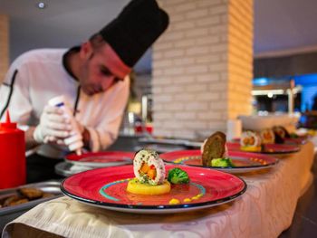 Гости могут отведать разнообразные блюда турецкой и интернациональной кухни в многочисленных ресторанах отеля типа «все включено», в том числе в главном ресторане, баре на пляже, баре у бассейна, лобби-баре и диско-баре Viva.