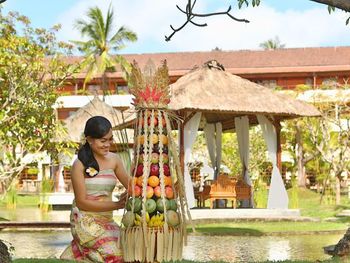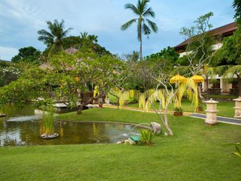 Очень красивая гостиница, выполненная в традиционном балийском стиле — много зелени, деревянных элементов, резных ворот и деталей, создающих атмосферу уюта и гармонии с природой. Всё продумано и выдержано в единой стилистике.