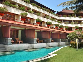 Отель был построен одним из первых, соответственно, на текущий момент состояние оставляет желать лучшего. Старая мебель, холодильник, который, практически не холодит, маленький сан. Узел, где тоже все старое. На 5 звёзд по качеству точно не тянет, зато по цене превосходит 5 звездочный уровень. Большая территория, много бассейнов, которые тоже не мешало бы почистить и обновить: убрать плесень, приклеить плитку. Надо сказать, что уровень цен в отеле и во всех рядом расположенных отелях минимум в 3 раза превосходит средний уровень на Бали. Ужинать ходили в Bali Collection, где много ресторанов и кафе, адекватные цены, но это все-таки территория шоппинга. Гулять вокруг негде, т.к. это закрытая туристическая резервация, кафе и ресторанов нет, только в отелях.