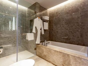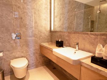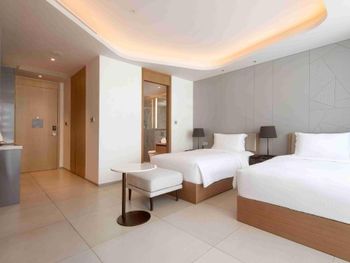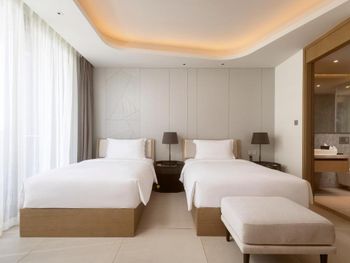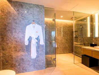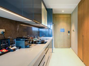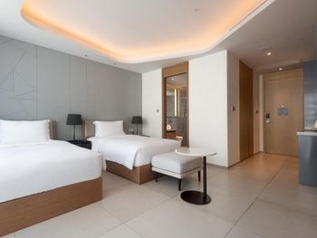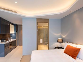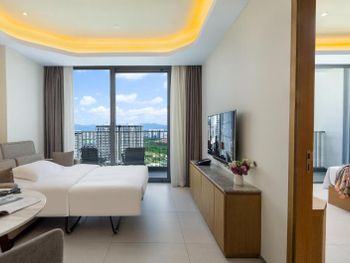 Очень удобные двухкомнатные апартаменты для семьи. Большой холодильник, плита, мультиварка. Дополнительную посуду принесли по просьбе. Замена полотенец каждый день, уборка номера каждый день. Халаты, тапочки, Сланцы в номере. Косметика - шампунь, кондиционер, гель, лосьон для тела - хорошего качества, своими не пользовались . Наличие стиралок и сушильных машинок. Ночной рынок через дорогу, супермаркет 800 метров. Отзывчивый персонал. Бассейн и тренажерный зал.