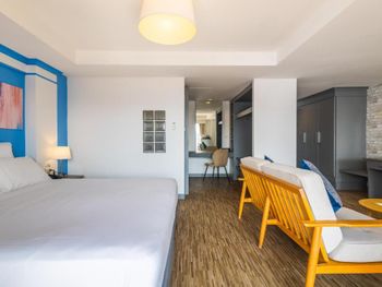 Хороший отель в удобном месте, всё необходимое в шаговой доступности при этом сам он находится в тихом месте. Номер чистый, ремонт не топовый но приятный за свою цену. Большой шкаф. Теплая вода в душе начинает идти относительно быстро как от проточника. В номере среднего размера холодильник (не минибар) полностью доступный, влезает много. Сейф, фен, не встроенный кондиционер что хорошо (хотя расположен он не очень так как дует поперек кровати), чайник, балкон со стульями (на балконе внешний блок кондиционера, перед ним можно поставить стул с влажными вещами на спинке и высохнут они довольно быстро). В общем для "прийти переночевать", "положить что то в холодильник", "помыться" нормальный номер.