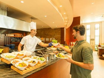 Очень вкусная и разнообразная еда: индийская, европейская азиатская кухня, мороженое, выпечка, десерты. Очень приветливый и внимательный персонал!