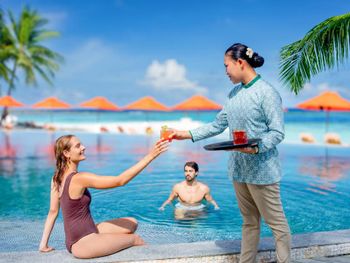 Замечательный отель.Хочу выразить благодарность всем ,кто имеет отношение к этому отелю.ОТДЫХ ПРОШЕЛ ЗАМЕЧАТЕЛЬНО.Очень хороший отель и сам остров. 1)Большая зеленная территория отеля.можно прогуляться и насладиться природой острова.2)Есть живой риф ,отель бережно заботиться о своем рифе и его обитателях.3)Чистейший океан,теплая водичка.4)На территории отеля несколько ресторанов,есть рестораны а-ля карт,если вас не устраивает шведский стол,то можно покушать в 2 х др ресторанах,на 2 острове отеля.В каждые 3 дня отдыха.отель подарит вам бесплатное посещение ресторана и массаж.Еще несколько экскурсий и рыбалка,За что можно сказать спасибо отелю.5)Завтраки типичные для азиатских стран.Не скажу что роскошно,но покушать вы найдете что.А вот обеды и ужины уже поинтереснее.Бывают тематические ужины,разных стран.Была даже паэлья,пюре картофельно,креветки )Чем очень порадовали европейцев)Все свежее,процесс приема пищи пройдет с прекрасным видом на океан.Отдельное удовольствие прием пищи с такими видами.6)Персонал очень старательный правда.Выполняет любую просьбу,Есть русско-говорящий персонал.Отдельное спасибо Микке,очень душевная и приятная девушка.Поможет вам во всех вопросах.В ресторане на обеде и ужине русскоговорящий Торри,спасибо ему за помощь и внимание.Так что не бойтесь,у кого проблемы и английским языком,проблем на острове не будет.У нас плохо работал вай-фай на вилле,нам любезно поставили второй роутер и проблема решилась,спасибо!.На территории отеля везде вай фай.7)Мы жили на вилле на воде,нам понравилось больше,чем на острове,из-за видов на бескрайний океан.Очень уютные номера.Проблем с водой не было ни с горячей ни с холодной.Убираются 2р в день.Везде чисто,что в номере,что на острове.В номере есть вода и сладкая вода в мини баре,плюс чипсы на перекус и орешки.Алкоголь.Вечером хаускипинг заботливо поставит водичку у кровати и зажжет свет,заправит постель и закроет шторы,очень милое внимание.8)Есть большой бассейн инфинити возле бара,виды красивые,