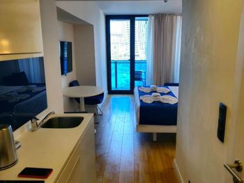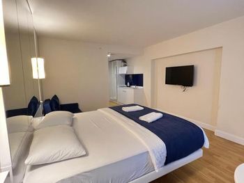 Очень хорошие апартаменты. На кухне Есть все необходимое: посуда, бокалы, электрочайник, кастрюли, сковорода, даже электрическая турка. Одна кровать двуспальная, а вторая маленькая - для ребенка. Владелица апартаментов очень внимательная и отзывчивая. Даже сама периодически спрашивала, все ли у нас хорошо. Месторасположение просто отличное: первая линия, вокруг много магазинов и остановок - уехать легко в любую сторону. Еще рядом есть столовая с приемлемыми ценами. Также плюсом является четвертый этаж. Судя по отзывам, на верхние этажи можно долго ждать лифт. У нас этой проблемы не было, как и шума, на который жаловались другие туристы. Может, просто был конец сезона и стало тише. Рекомендую данные апартаменты.