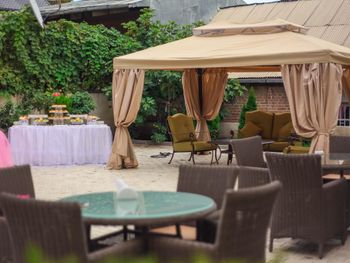 Вид на горы. Тихо, спокойной. Во внутреннем дворике есть качель и под навесным шатром пару столиков для отдыха. Дружелюбные и улыбчивые сотрудники отеля, всегда приятные в общении и внимательные.