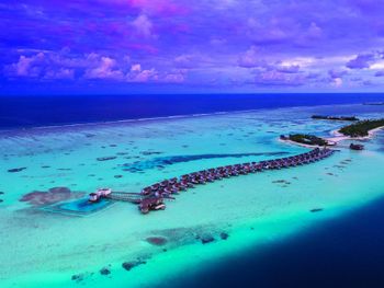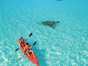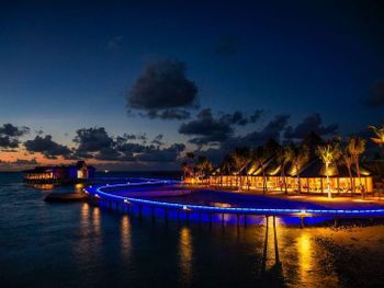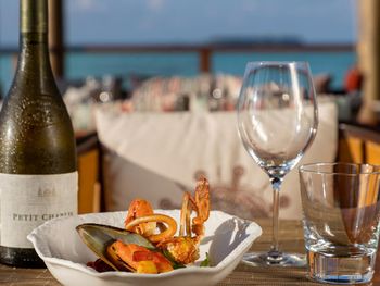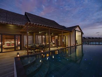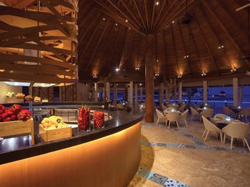 Очень хорошо кормят. Много морепродуктов. Вот всё что ты только можешь придумать из еды, там есть. Даже чёрная икра и французское шампанское. В номер постоянно добавлять в бар вино белое, красное и шампанское. Жили на вилле на воде. Ночью домики подсвечиваются и видно всех самых страшных обитателей морских.