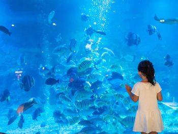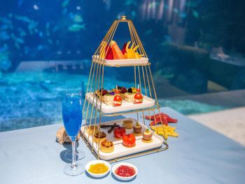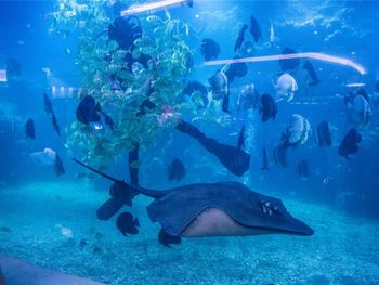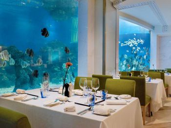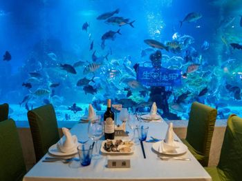 Аквариум в ресторане с акулами, скатом и другими рыбками
