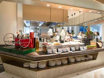 Завтрак. Ресторан поделён на 4 островка с разными наполнениями: напитки и выпечка, овощи, фрукты, сухие завтраки, каши и крупы и несколько вариантов местных продуктов. Неудобно что приходится курсировать между этими 4 островками еды, которые не так сильно заполнены. Если убрать декорацию, то всю еду можно было бы уместить на 1-2 островка. Выбор еды кажется большим, но понравится он в основном местным. На завтрак они едят лапшу с бульоном.