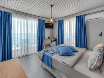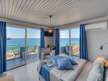 + Очень хороший завтрак, можно завтракать на террасе с видом на море, собственный и ухоженный пляж, шезлонги и зонтики. Бассейн, хорошее месторасположение. Ремонт хороший - но нужно сделать генеральную уборку и исправить недостатки. Часть персонала вежливая и приятная (мужская часть коллектива). Вид на море из окна. Для нас главное был пляж и море, за это можно поставить оценку 5, на больше не тянет. - Грязные номера, пыль, грязный пол, постельное и полотенца старое, с катушками и пятнами. Полотенца были только банные ( разные, с бирками другого отеля ) и для ног. Для лица ( ручных) - нет. Из косметического набора были только два шампуня. Гель для душа, мыла, тапочек - нет. ( на ежедневной уборке, не доносили, мы попросили сами ). Нет воды - бутилированной, только на завтраке из кулера, чая и кофе в номер не положили. Света недостаточно, воняет канализация. Сломанная сантехника. Дверцы в душевую еле раздвигаются, нужно приложить усилия. Плесень. Кровать сломана ( палка на одной стороне поломана и продавлена часть кровати, спали на одной стороне ?). Дается одно 1,5 спальное покрывало, нет пододеяльника. Вещи повесить не где, так как палка для плечиков в шкафу - без плечиков. К ежедневной уборке, есть вопросы, точней к горничной, которая размазала грязь по полу и не прошла мимо двух пар обуви своей ГРЯЗНОЙ ШВАБРОЙ. При смене полотенец, скинула вещи на пол ( трусы, носки ), наверное тяжело было положить на кровать, для ног - не сменила. Уже потом пожалели, что попросили поменять полотенца и сделать влажную уборку.