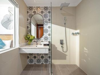 - душ не имеет перегородки, поэтому при сильном напоре весь пол в ванной комнате может быть в воде - не хватало сушилки для вещей после пляжа в комнате или в ванной - утром слышно, но не критично уличная музыка для зарядки