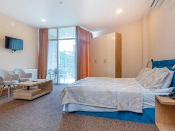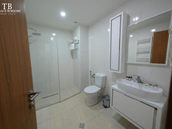 Номер очень большой. Бесплатная вода в номере. Большой санузел со стеклянной перегородкой (редкость для Грузии). Из туалетных средств было мыло, гель для душа и шампунь.